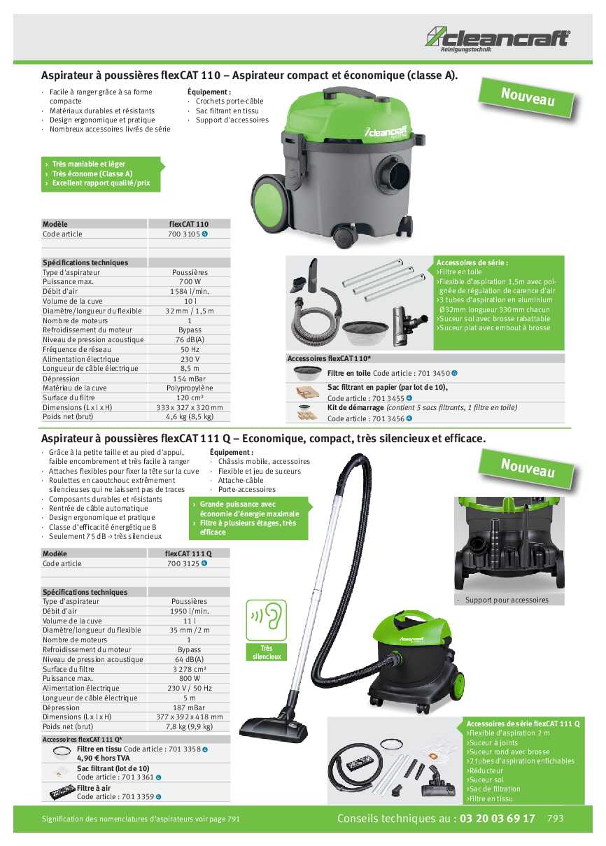 Aspirateur à poussières flexCAT 110 – Aspirateur compact et économique (classe A).