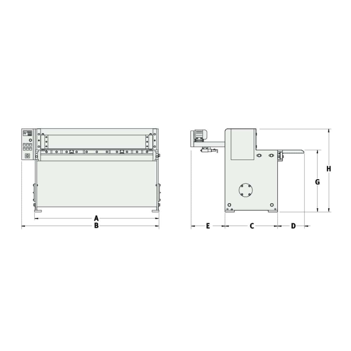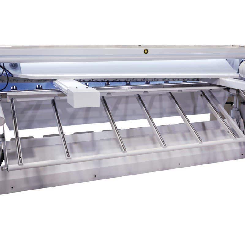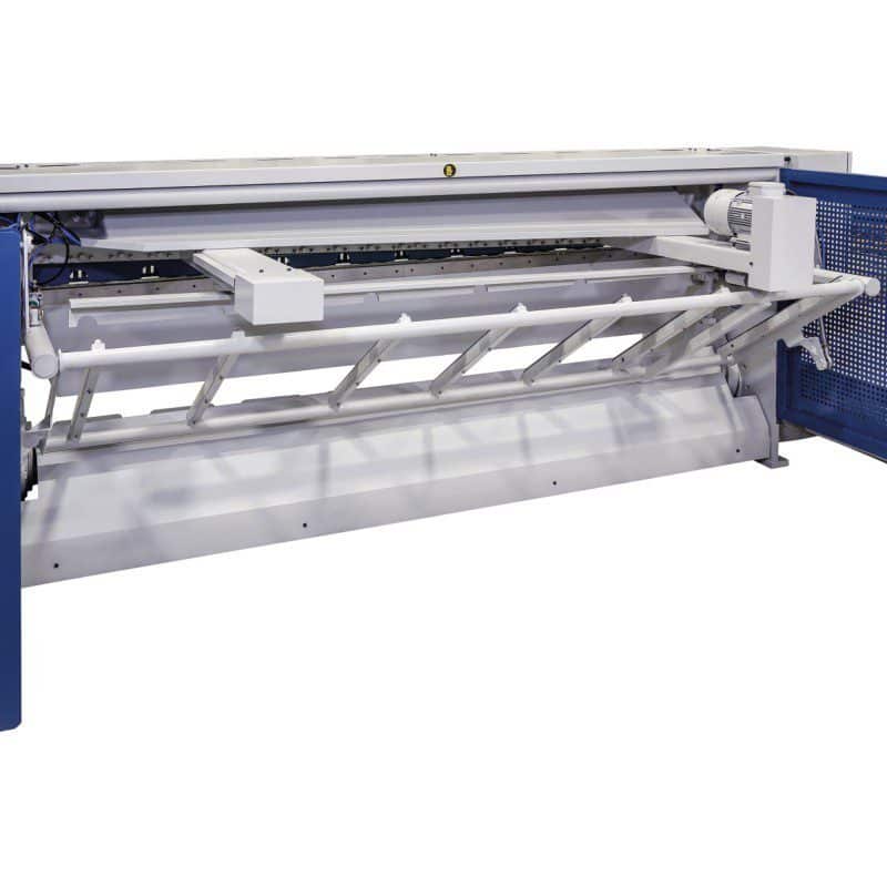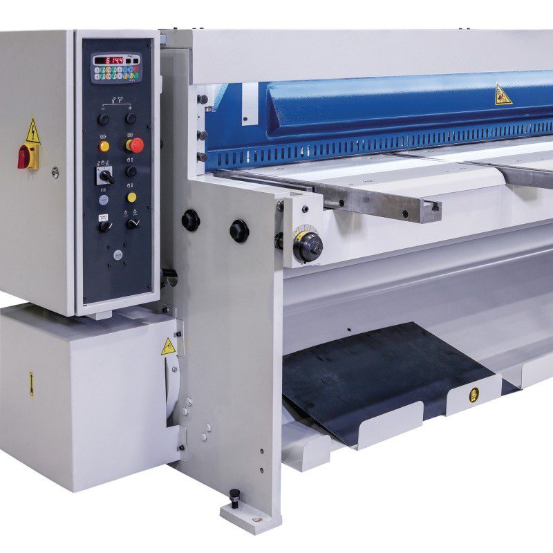 Série MTBS-T – Cisailles à tôle motorisées avec butée arrière à commande numérique, déchargement de la tôle à l’avant et à l’arrière et réglage manuel de la longueur de coupe.