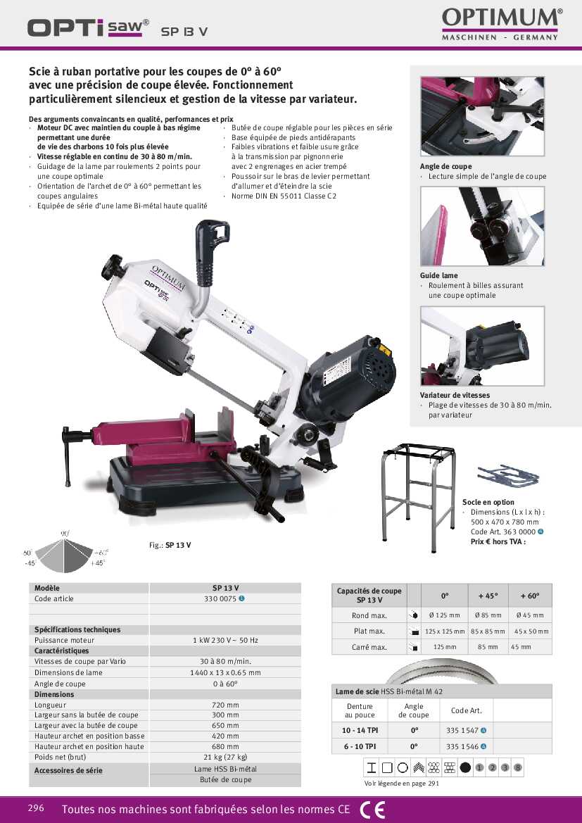 - Compatible avec la scie à ruban Optimum SP 13 V