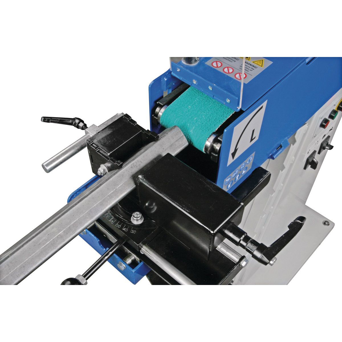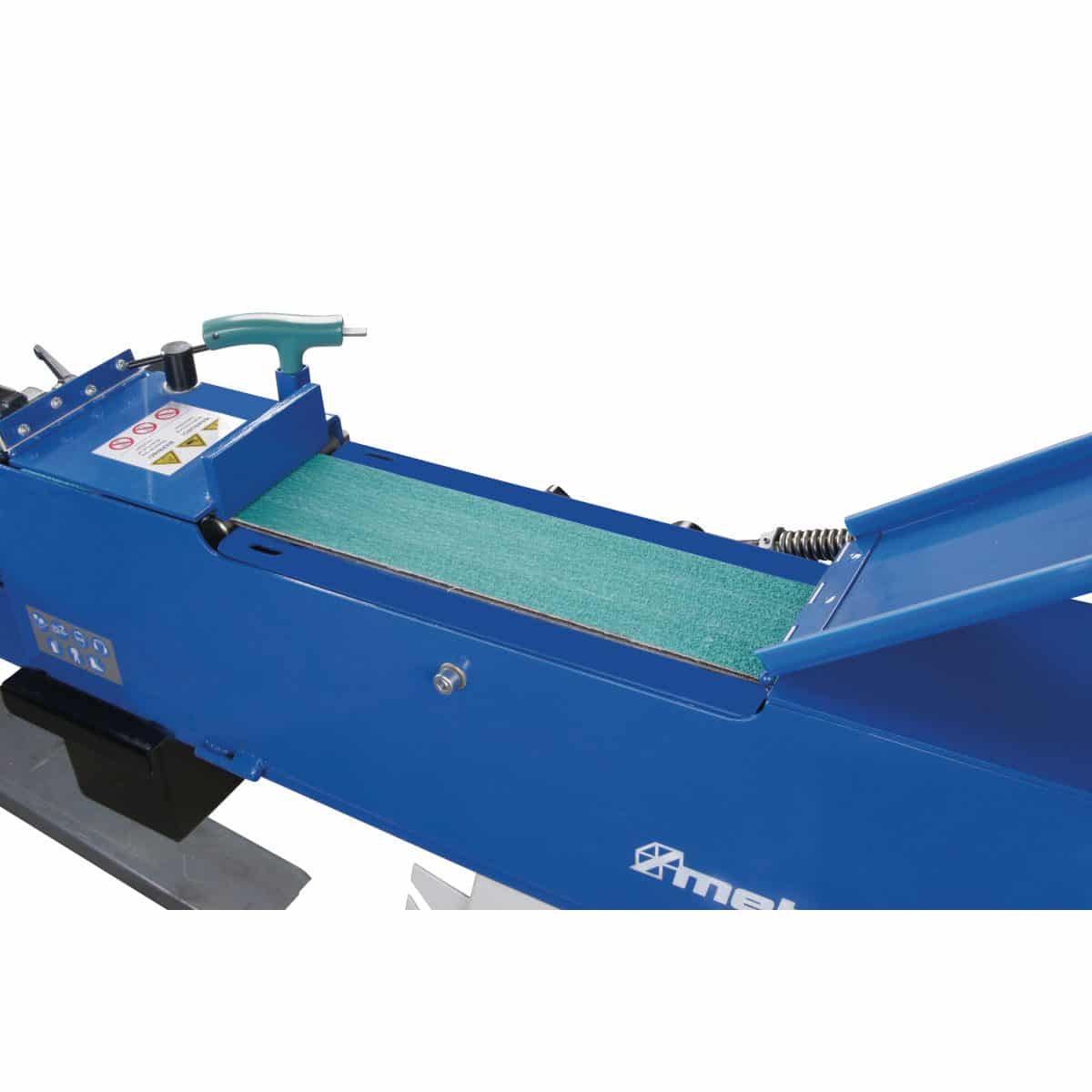- 2 vitesses de défilement de la bande pour s’adapter parfaitement au matériau usiné (15 m/sec. pour l’acier inoxydable et aluminium, 30 m/sec. pour l’acier)