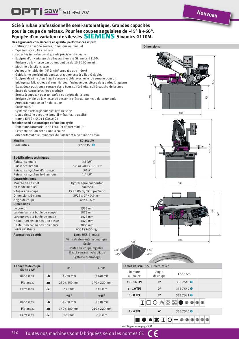 Scie à ruban professionnelle semi-automatique. Grandes capacités pour la coupe de métaux. Pour les coupes angulaires de -45° à +60°. Equipée d’un variateur de vitesses SIEMENS Sinamics G110M.